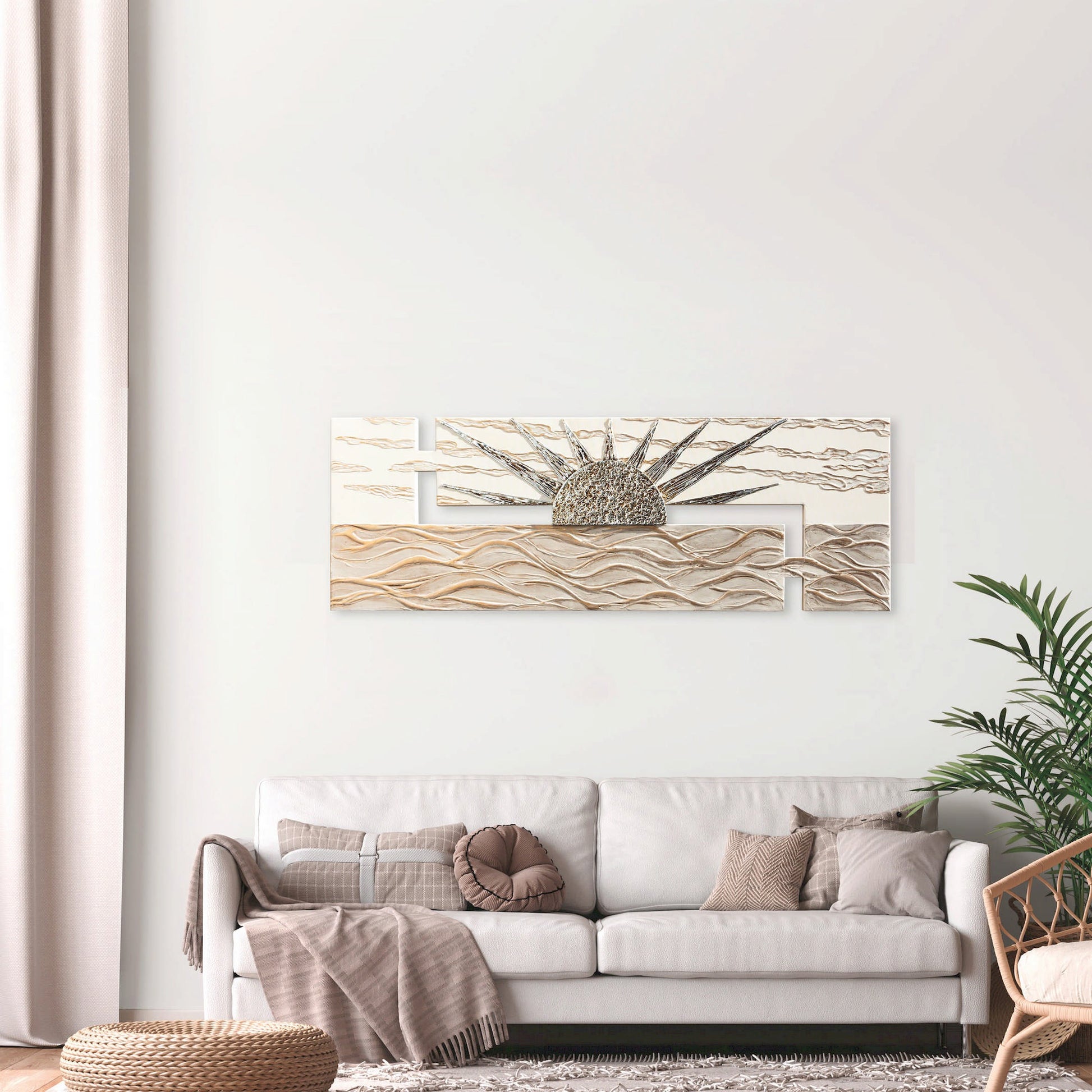 Quadro con struttura a doppia elle, decorato a mano con lavorazione materica. Elemento centrale a rilievo decorato con materico e foglia oro.