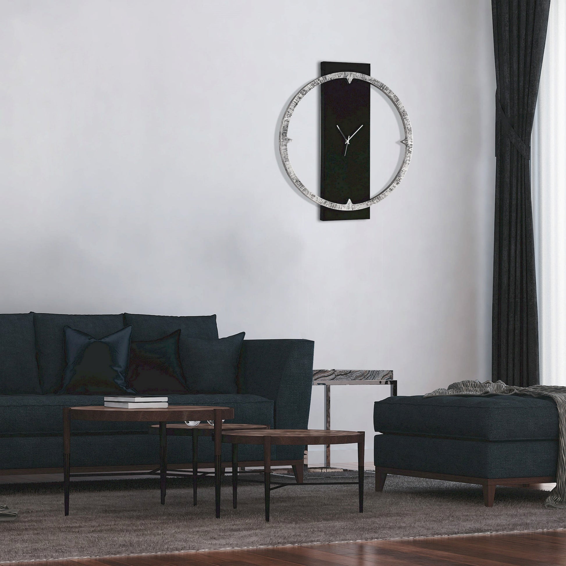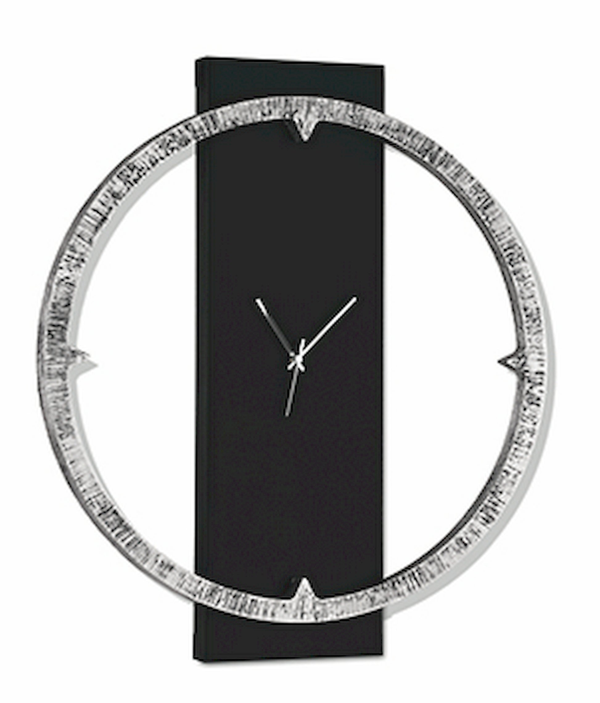 Telaio telato laccato nero, con elemento sagomato circolare decorato a mano con foglia argento su lavorazione materica.