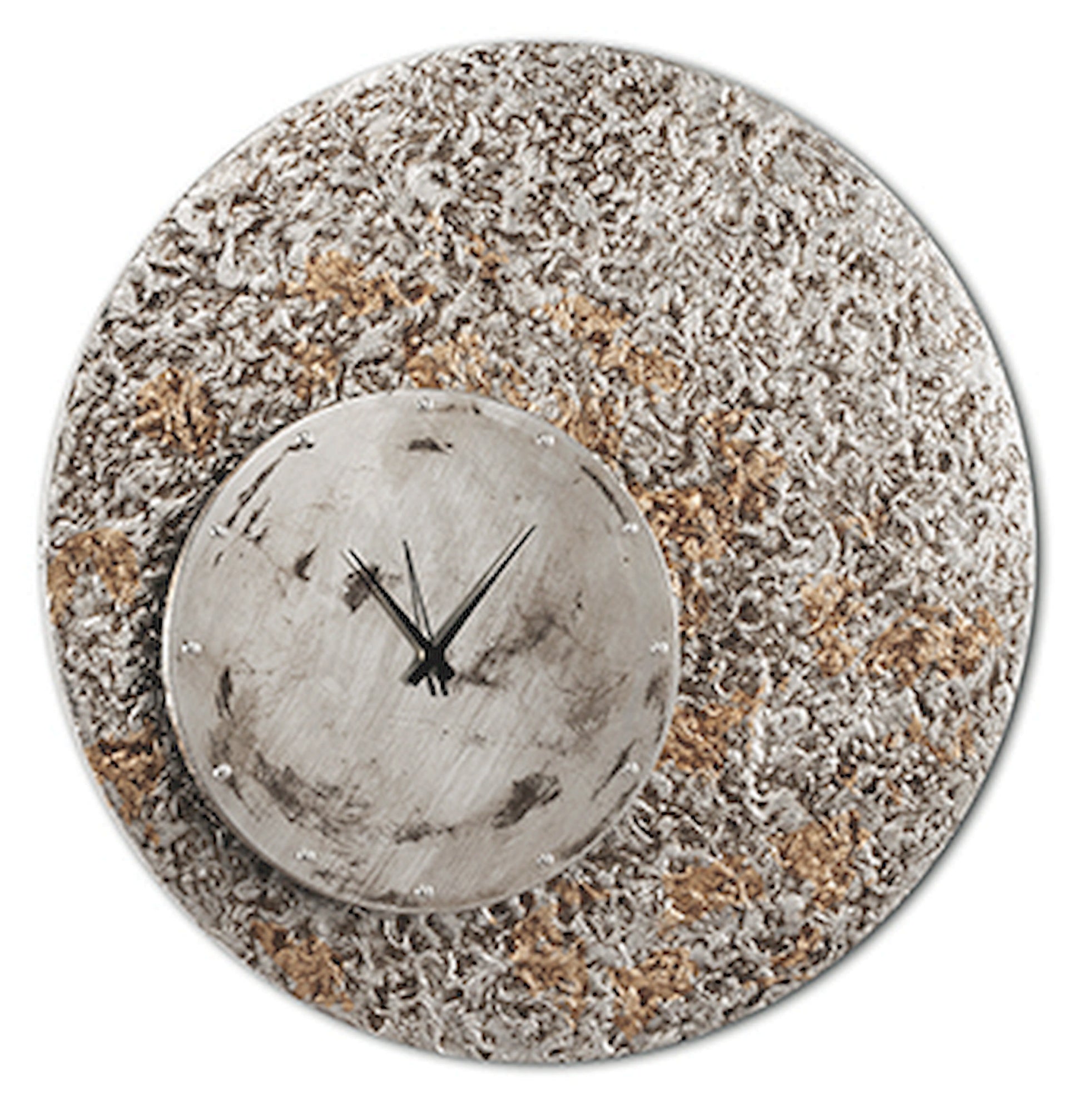 Orologio con due elementi sovrapposti decorati a mano con foglia oro e argento su lavorazione materica a rilievo.