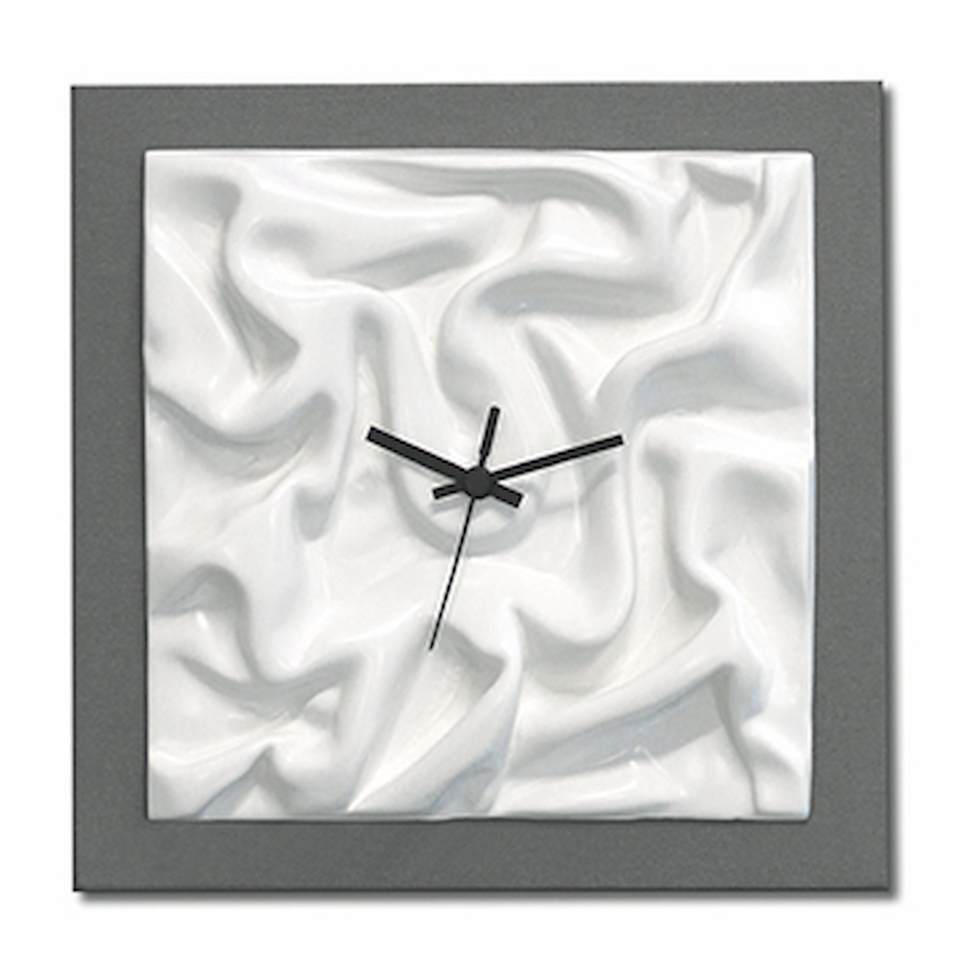 Telaio telato laccato grigio quarzo con elemento in bassorilievo laccato bianco avorio. Lancette nere.