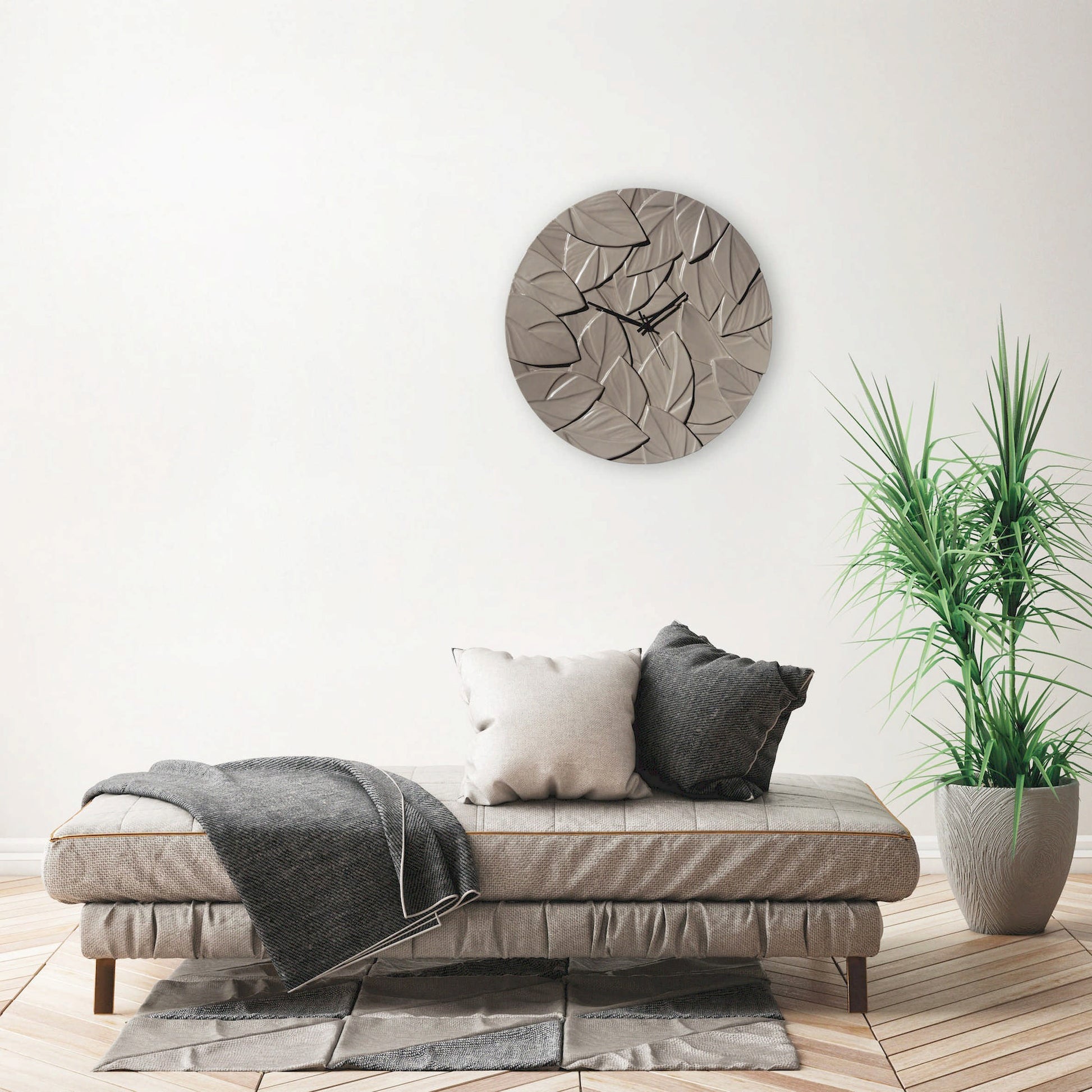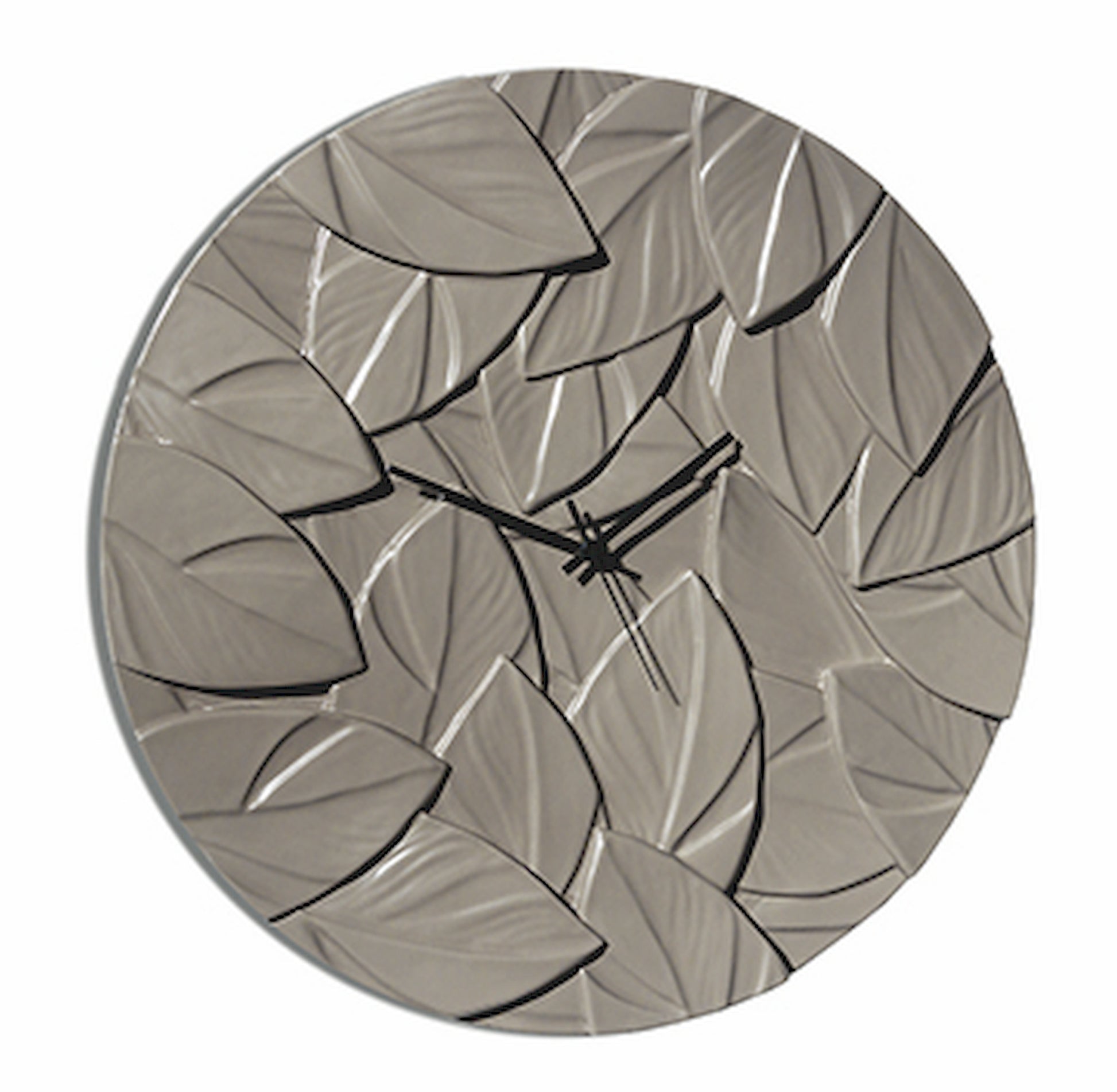 Orologio in ceramica composita con decorazione in bassorilievo. Finitura lucida color grigio fango e lancette nere.