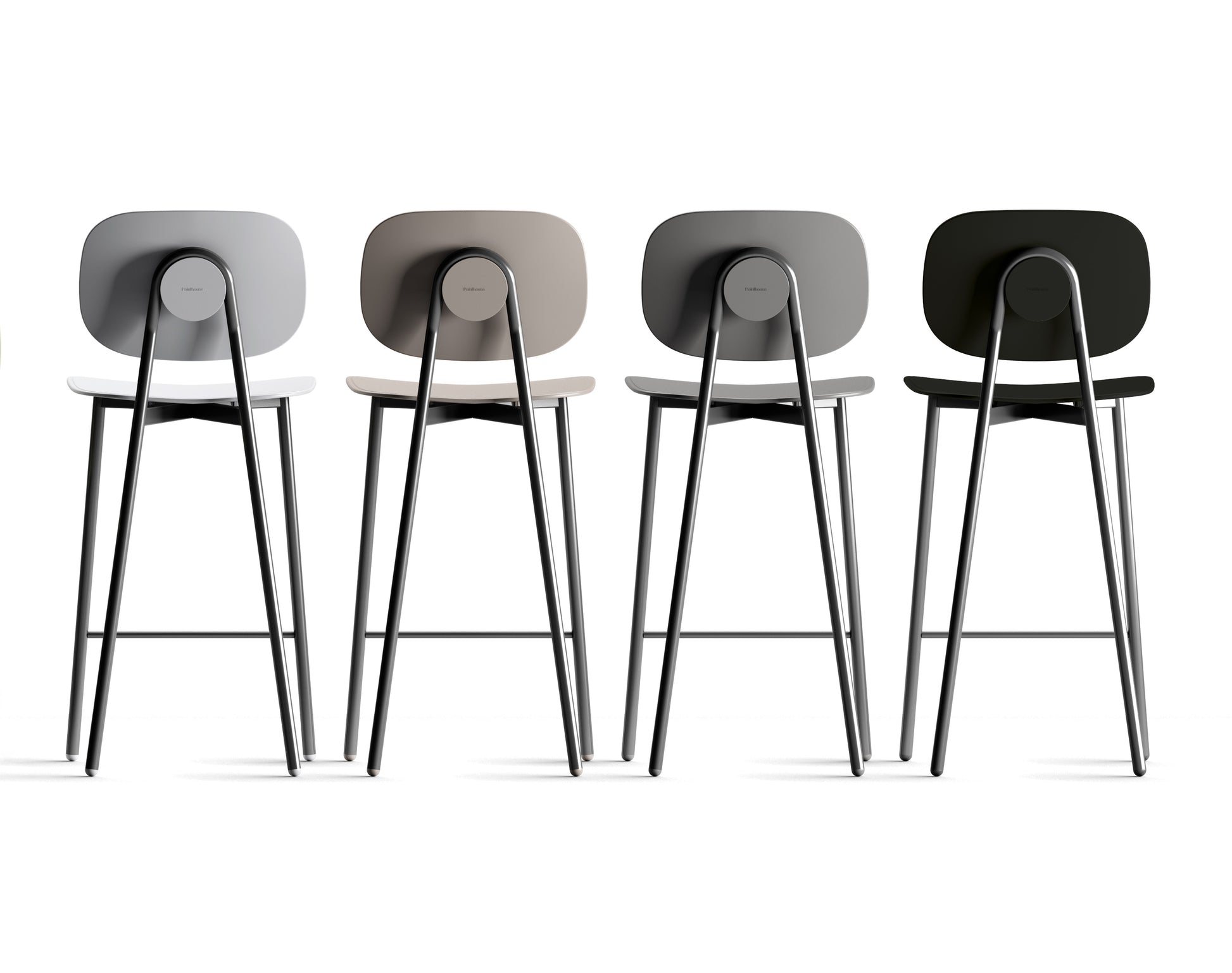 Sgabello con fusto in tubulare a sezione tonda. Disponibile con seduta e schienale in polipropilene rinforzato con fibra di vetro, in melaminico e rivestita in tessuto.