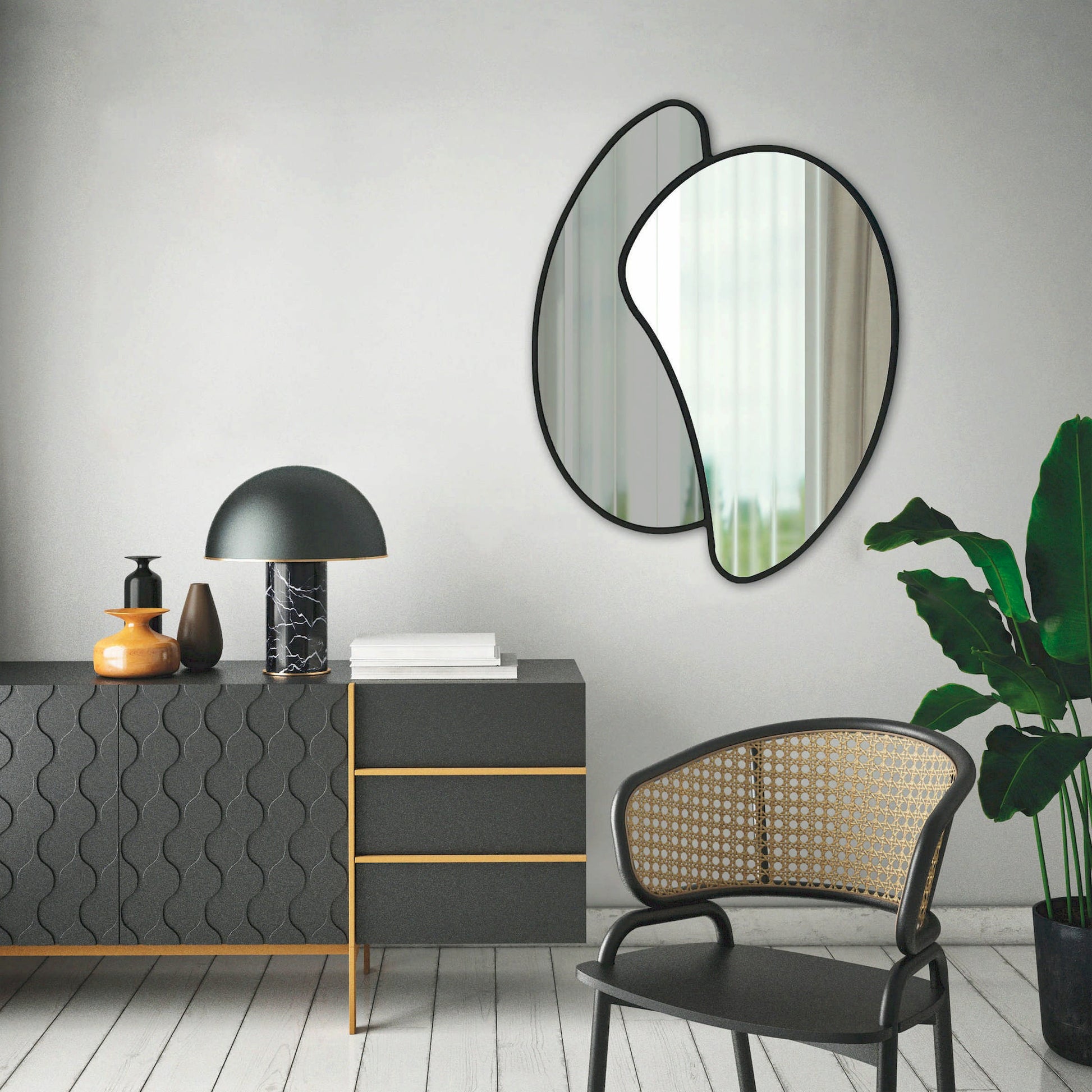 Specchiera con particolare struttura sottile sagomata e laccata nera. Due specchi, di cui uno color fumè.