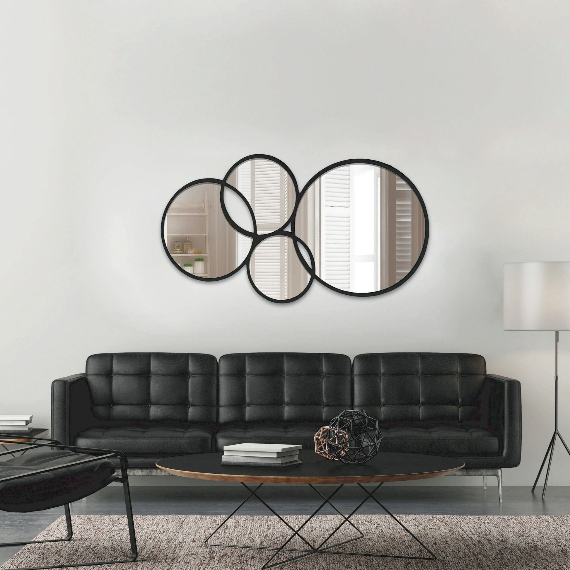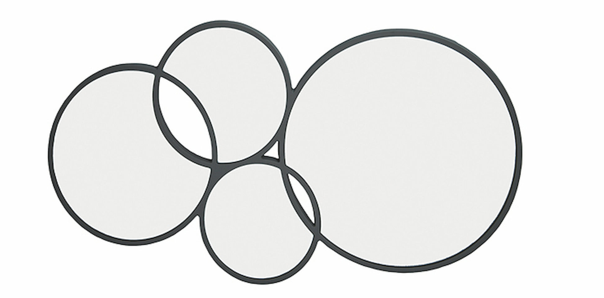 Specchiera con struttura traforata a forma di anelli e laccata nero.