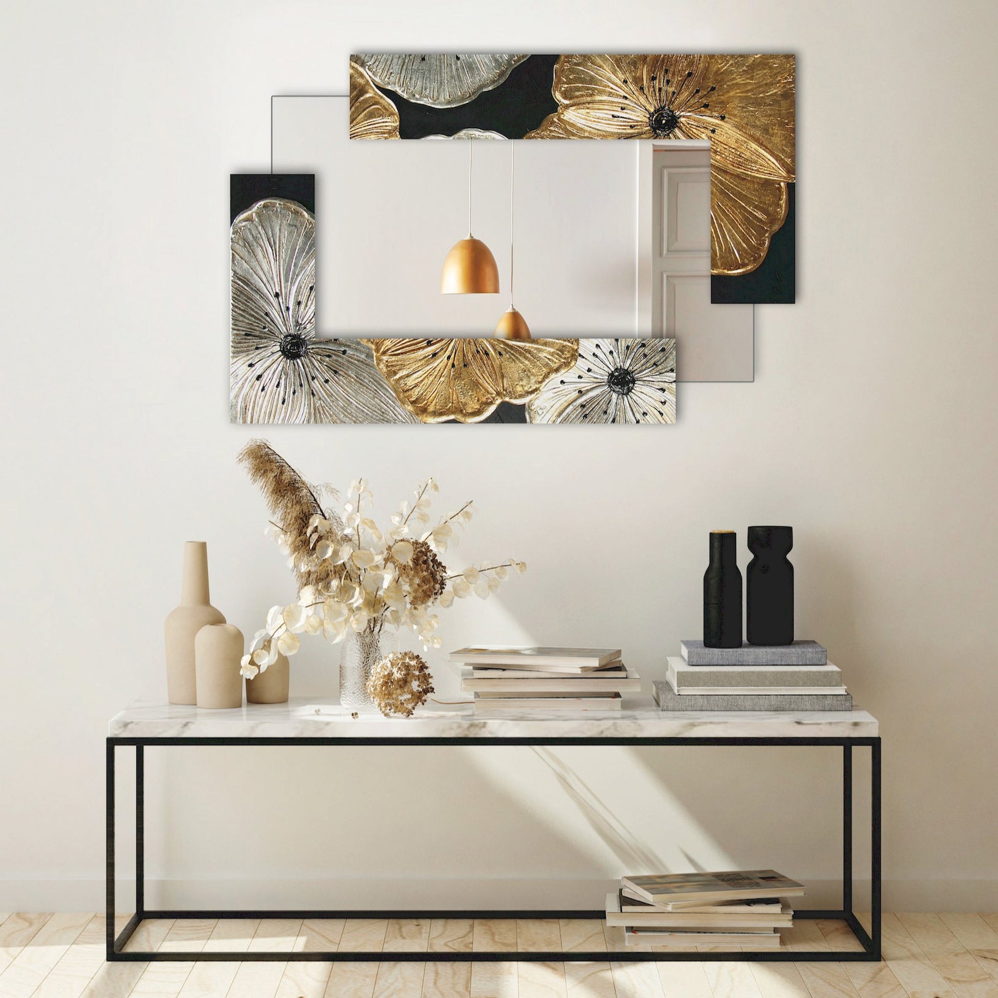 Specchiera con struttura a doppia-elle decorata a mano con foglia oro e argento su lavorazione materica a rilievo. Dettagli in resina e finitura lucida. Specchio a sbalzo. Possibilità di affissione orizzontale o verticale.