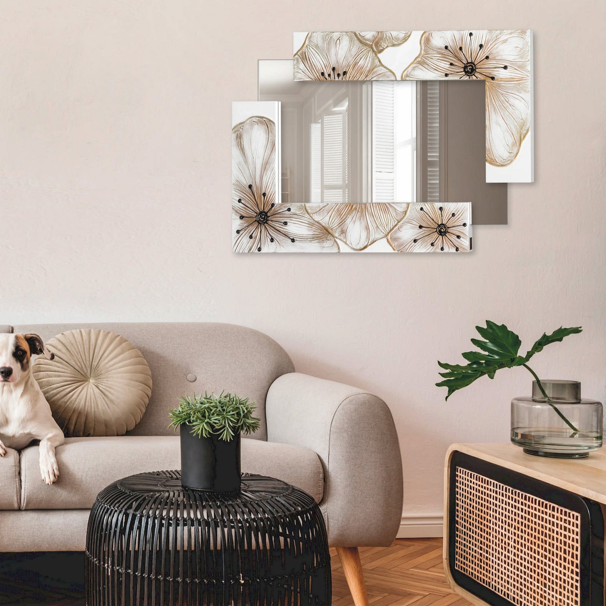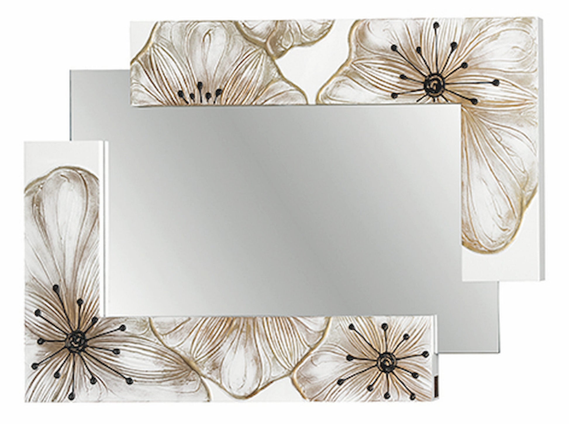 Specchiera con struttura a doppia-elle decorata a mano con lavorazione materica a rilievo. Dettagli in resina e finitura lucida. Specchio a sbalzo. Possibilità di affissione orizzontale o verticale.