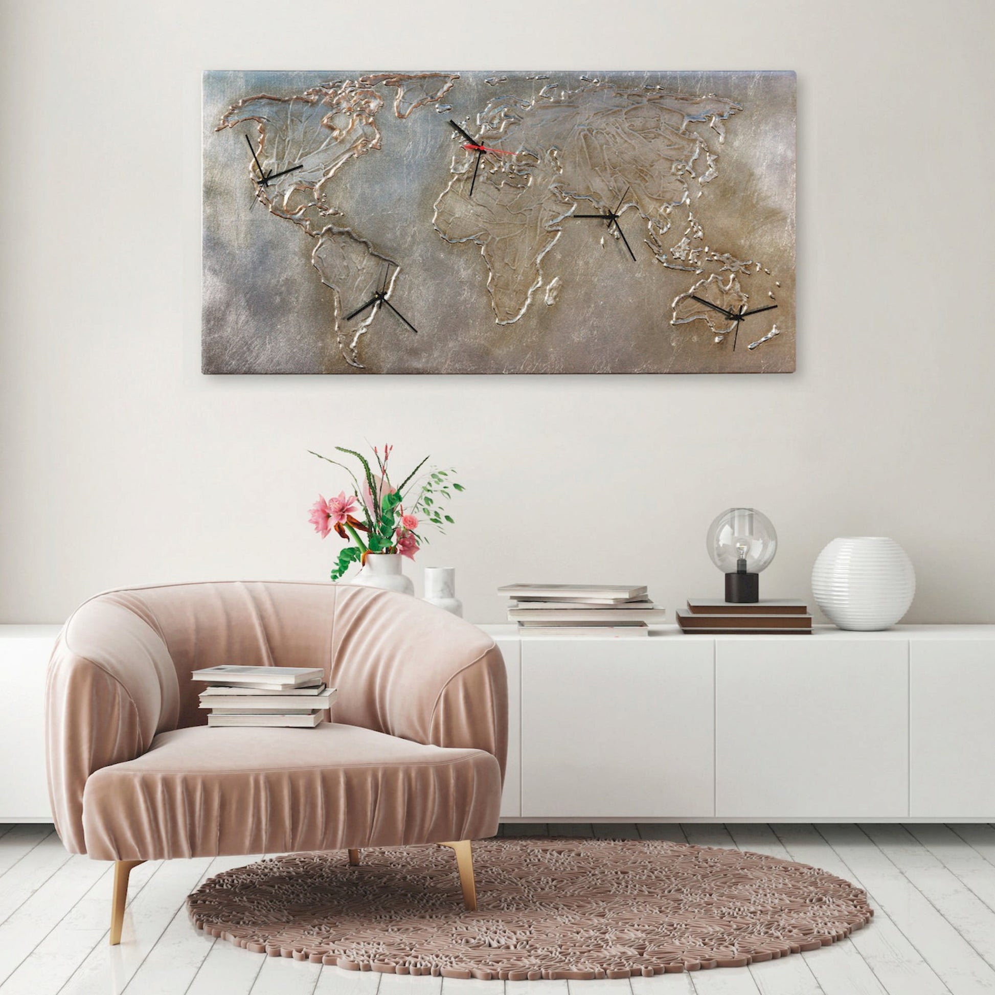 Orologio con cinque quadranti su telaio telato decorato a mano con lavorazione materica in rilievo e foglia argento.